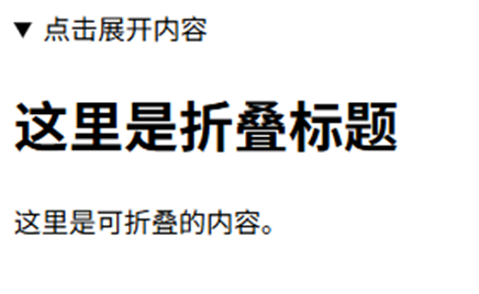 <details> <summary>点击展开内容</summary> <h1>这里是折叠标题</h1> <p>这里是可折叠的内容。</p> </details>